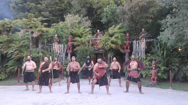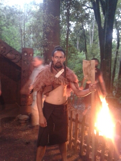 After this we joined the rest of the public for the evening part of the Maori experience. This includes a tribal Maori welcome, where you cannot smile and then you wander into the forest for more educational displays of various weapons, their tattoos and strength building tasks. Men were also invited to learn the Haka.