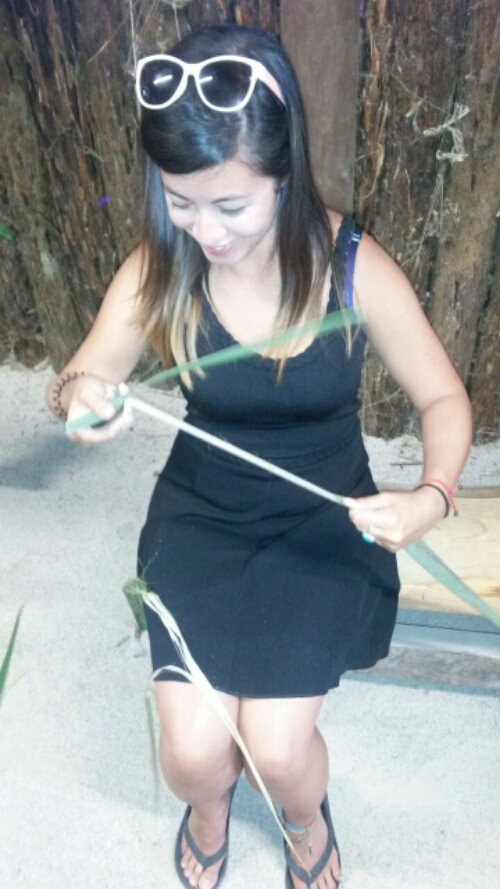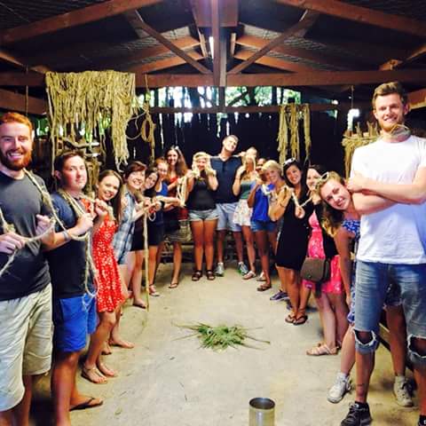 We then got down to some activities, firstly we learnt how to make rope from flax leaves by extracting the fibre and plaiting the strands. Every Kiwi bus that passes through the village adds their rope to an existing one which will remain and continue on in the village for years to come.